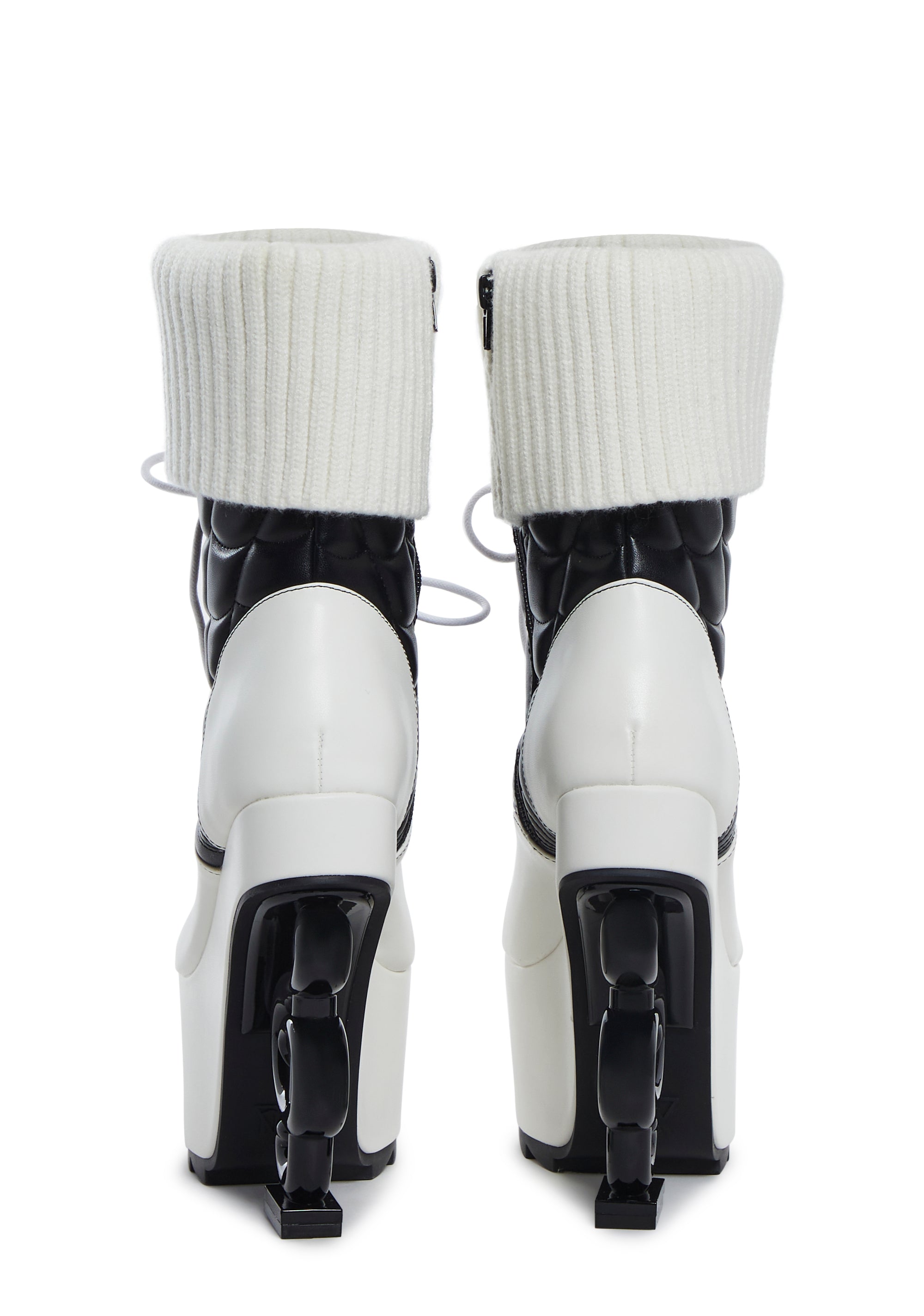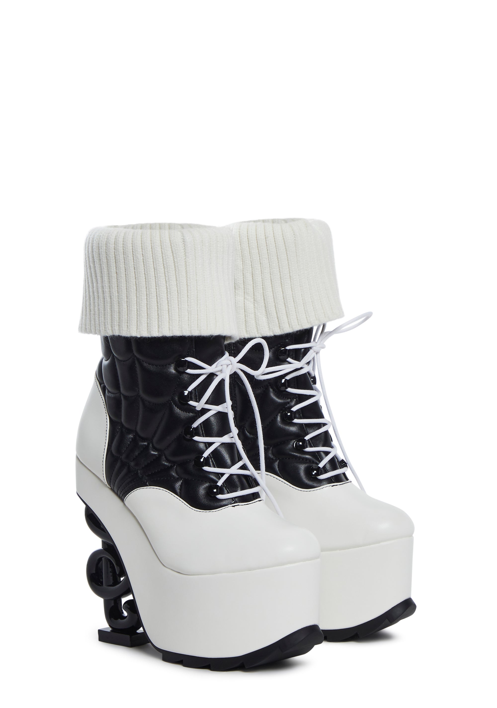 Inspired by Operetta,these platform boots have a vegan leather construction, a padded embroidered spider web stitch design, knit ribbed faux socks,front lace-ups, platform soles, music note heels, and side zipper closures.